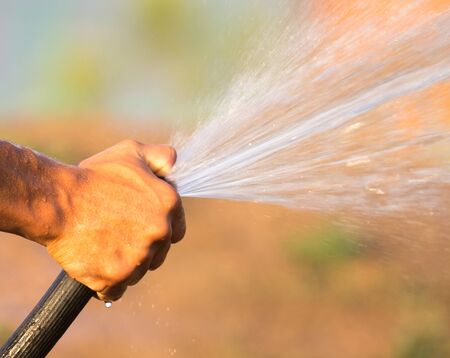 Man holding hose for watering plants in a garden. A powerful jet, a stream of clean water, drops aimed at the plants, on a lawn. garden care at summer