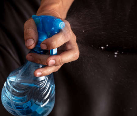 A hand holding a spray bottle emitting a fine mist on a moody dark background, symbolizing control and precision