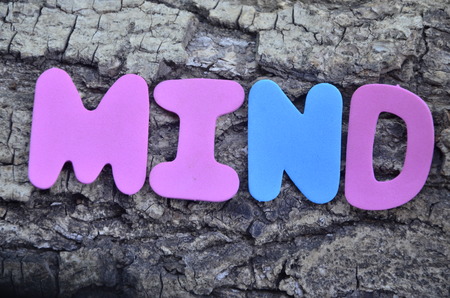 Contemporary artwork. Conceptual portrait of faceless woman with word mind instead face. Human emotions, psychology, mental health concept.