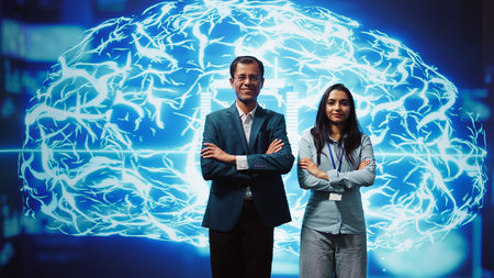 Admins using artificial intelligence computing simulating human brain thought processes in computerized model. Portrait of employees working with AI machine learning algorithms, camera B