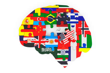 Flags of different countries painted on the brain from puzzles. 3D rendering isolated on white background