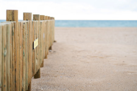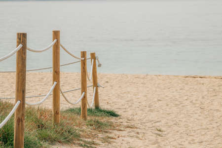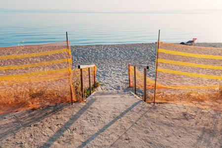 Temporary fencing marks access to a quiet sandy beach with a wooden walkway and calm sea in the distance. Scene suggests restricted entry, coastal management or preservation efforts. Selective focus.
