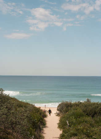 Generic surfer heading sdown path to surf beach in summer