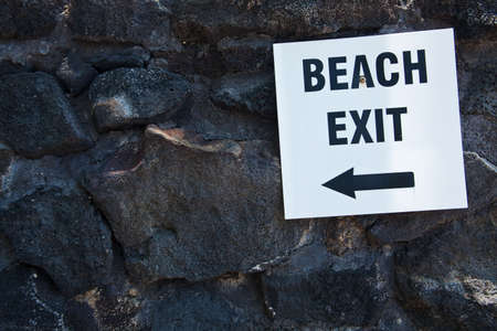 Wooden beach sign on sandy path with ocean view