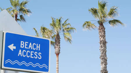 Beach sign and palms in sunny California, USA. Palm trees and seaside signpost. Oceanside pacific tourist resort aesthetic. Symbol of travel holidays and summertime vacations. Beachfront promenade.