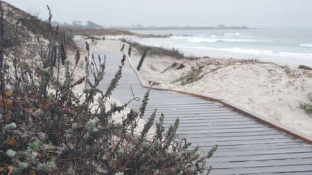 Ocean beach sandy dunes, Monterey nature, California misty coast, USA. Foggy rainy calm autumn or winter weather, grey cloudy sky. Trail path on shore near cold sea waves. Boardwalk from wooden planks