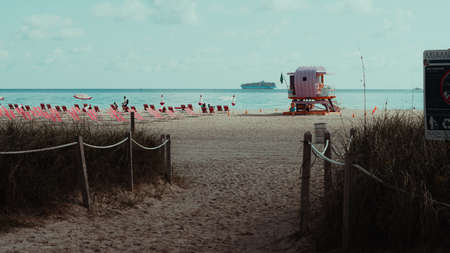 Miami beach. Miami South Beach day time with lifeguard tower and coastline with colorful cloud and blue sky.