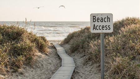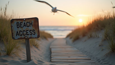 Rustic Beach Access sign on sandy beach with boardwalk dunes seagulls and sunset