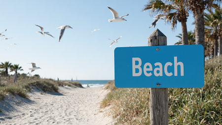 Tropical beach scene with Beach sign palm trees and flying seagulls