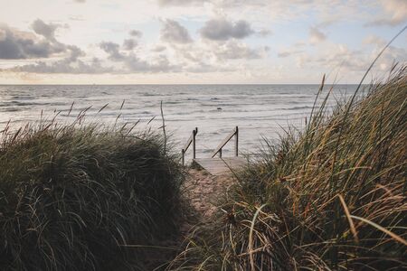 Beach crossing on the island of Usedom to the Baltic Sea. White sand and dune grass. Nature photo from a German island