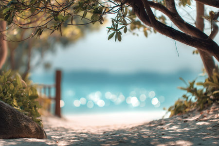 Serene tropical beach pathway leading to shimmering waters and lush greenery in a blurred bokeh effect