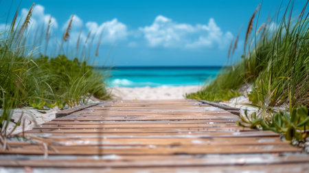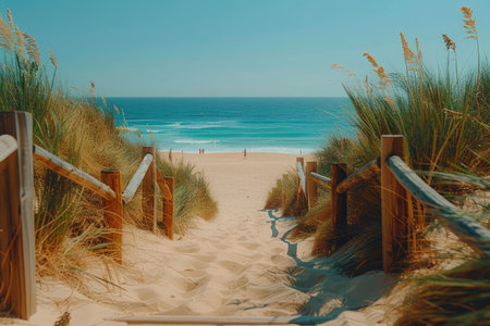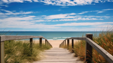 AI Generated. Exploring a Scenic Wooden Walkway to the Ocean Coastal Paradise Nature Tranquil Landscape Serene Views