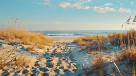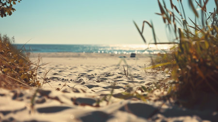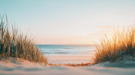 Serene Beach Scene with Soft Dunes and Sunlit Grass at Sunrise on a Tranquil Morning by the Ocean Shore