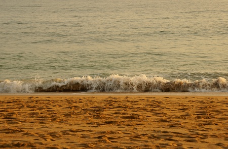 Sea waves and warm sunset light, calm and relaxing sandy beach