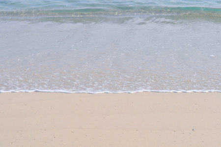 Soft ocean wave gently rolling on the sandy beach during a beautiful golden sunset, creating a peaceful and serene atmosphere