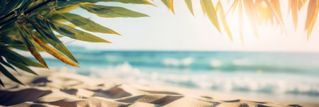 Tropical beach panoramic banner with green tropical leaves.