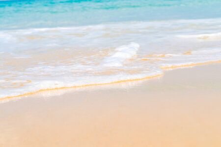 Close-up soft wave of the sea on the sandy beach in morning with sunlight effect.
