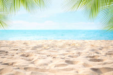 Pile sand beach with palm leaves or coconut leaves at coast and blur blue sea with bokeh with blue sky. tourist travel tropical holidays summer nature concept.
