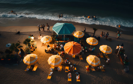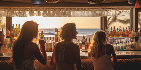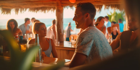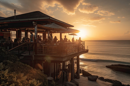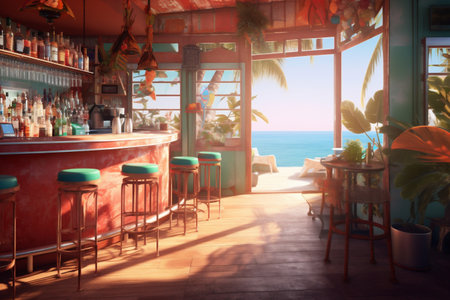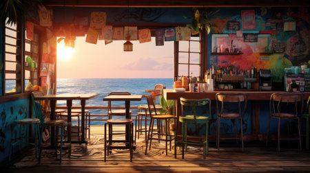 A bustling seaside bar comes alive during the summer. Vibrant conversations, clinking glasses, and the sound of laughter fill the air, creating a lively and festive atmosphere. AI Generative AI