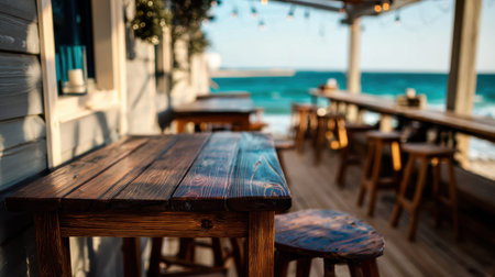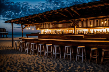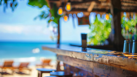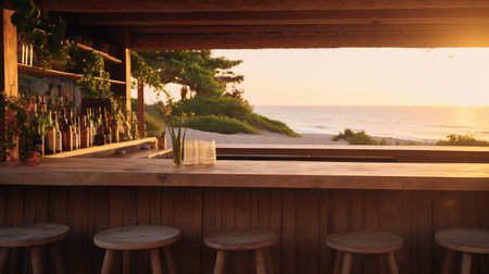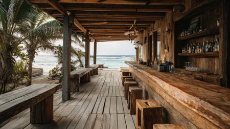 Discover a tranquil beach bar with a rustic wooden counter and panoramic ocean views. Perfect for relaxation and enjoyment in a tropical paradise.