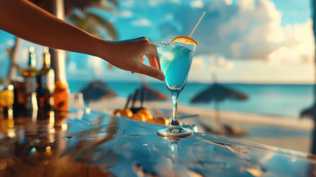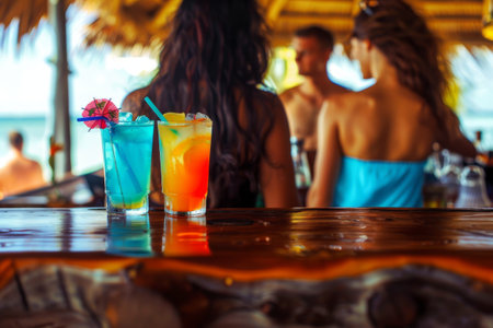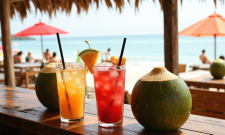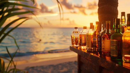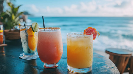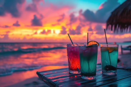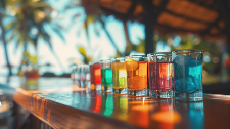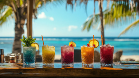 Refreshing cocktails are lined up on a beach bar, ready for tourists to enjoy on a sunny day