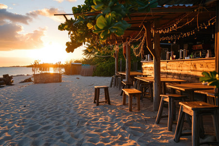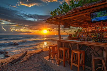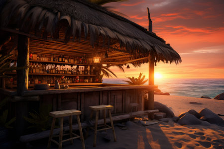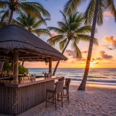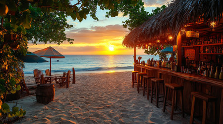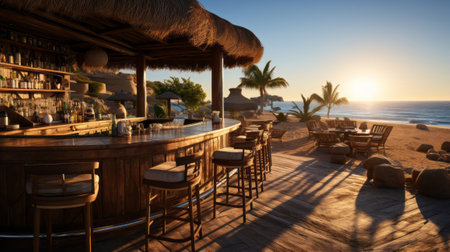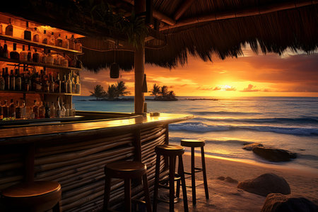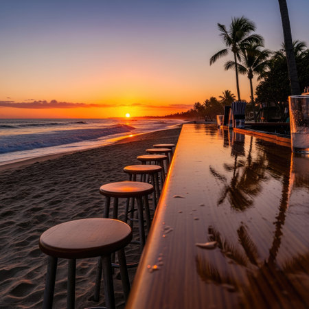 A beachfront bar is featured in this image, showcasing a bar area with stools. Palm trees frame the view of the ocean during a sunset, and golden light. The scene implies a tropical setting with potential uses for travel, leisure, or hospitality related projects.