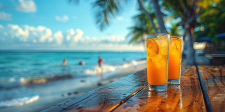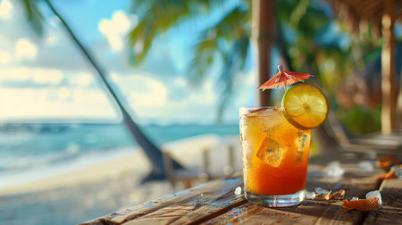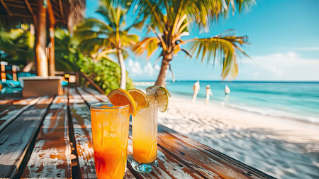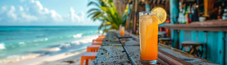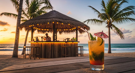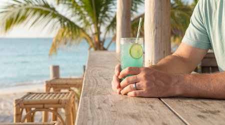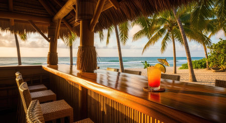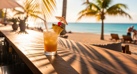 A wooden bar with a cocktail in front of an ocean view is presented. The scene captures the essence of a tropical getaway, with palm trees and a sandy beach. The lighting suggests a warm, sunny day. Ideal for promoting vacation and relaxation themes.