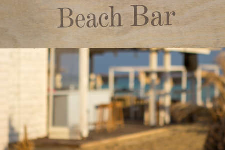 Wooden bar and chairs on the beach with sea and sky background