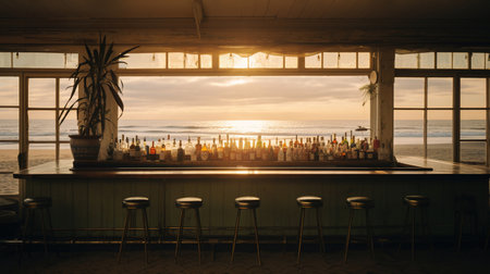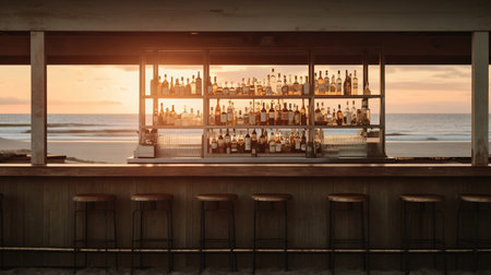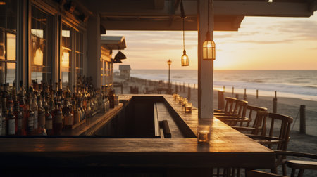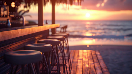 A row of bar stools sit on the edge of a wooden bar overlooking a beach. The composition captures the golden light of sunset, reflecting on the surface. Silhouettes of palm trees and the ocean create a backdrop. The scene suggests leisure and relaxation and is suitable for various commercial purposes.