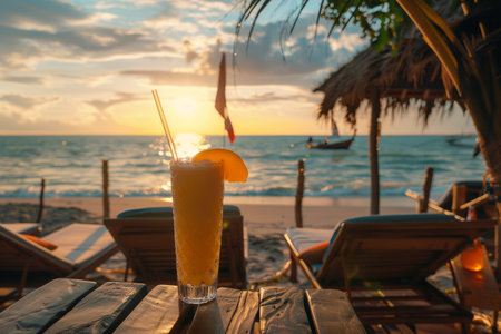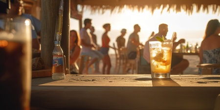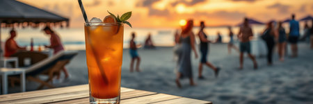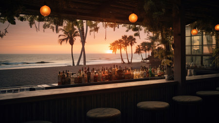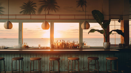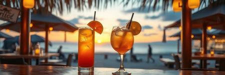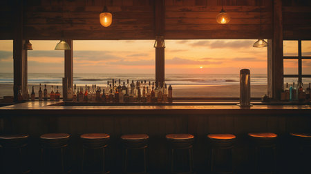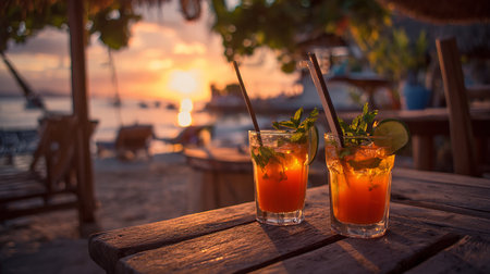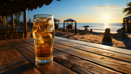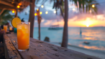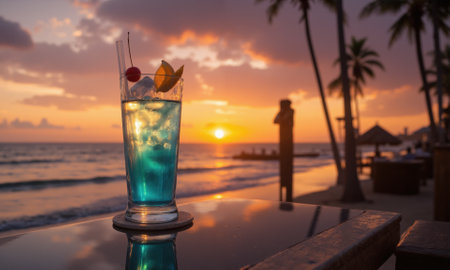 Refreshing cocktail resting on a bar with sunset beach view and cozy atmosphere