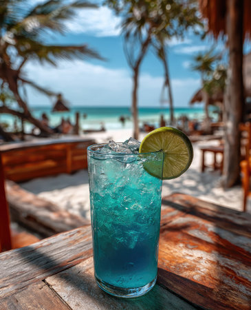 A vibrant, blue cocktail in a tall glass, garnished with a lime slice, sits on a wooden table. The drink's cool tones contrast with the warm wood, while the beach scene in the blurred background suggests an outdoor setting under bright sunlight. Suitable for use in lifestyle, travel, and food-related projects.