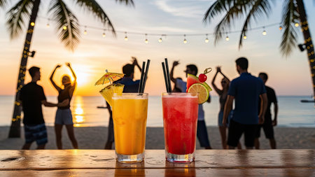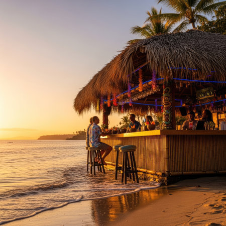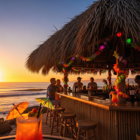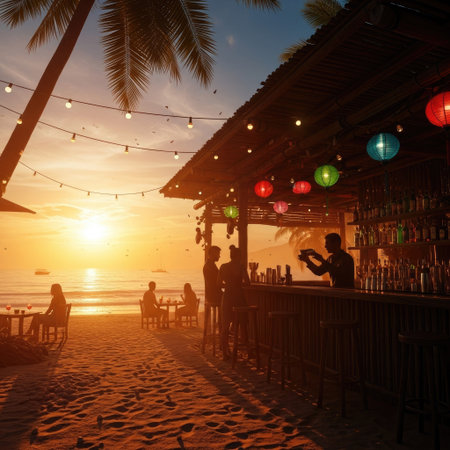 Sunsets, tropical cocktails, and beach vibes create a perfect evening atmosphere by the shore