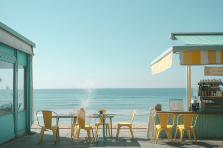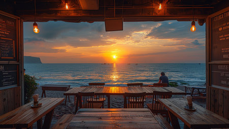 a coffee shop with a beautiful view of the sunset on the beach. generative ai