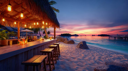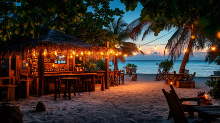 Cozy beach bar with string lights creating a magical ambiance on a tropical island at sunset