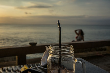 Drink in front of ocean scenery with woman posing in background