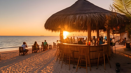 Beach bar with seascape at sunset or sunrise. Generative AI.
