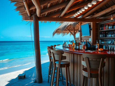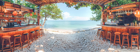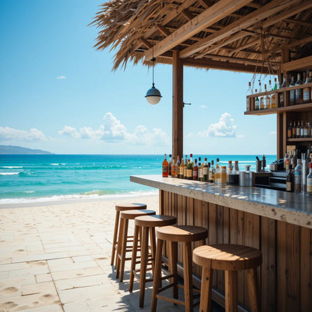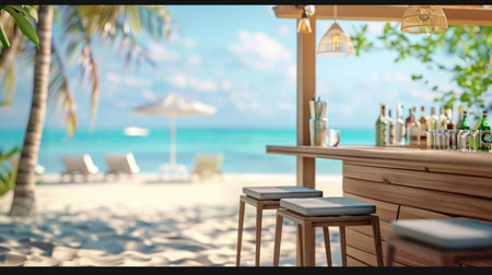A beautiful open-air beach bar with a wooden counter and stools on a sandy shore. Overlooking the turquoise ocean, it creates a relaxing summer vacation setting. Space for text on sand and sky.