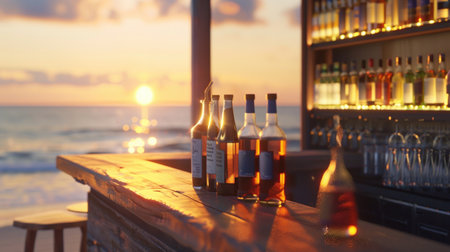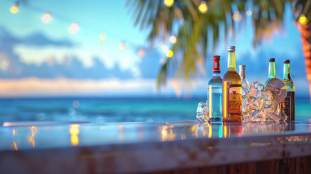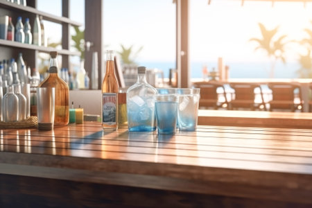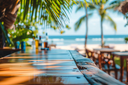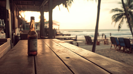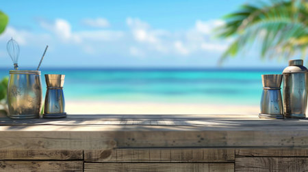 A serene beach bar scene unfolds with a wooden counter in focus, overlooking a sandy beach, clear blue ocean, and swaying palm trees. Bottles and cans add a casual touch, evoking vacation vibes.