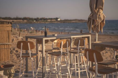 Sunny. An empty bar counter and an empty chair against the background of the beach and the sea. Vaca