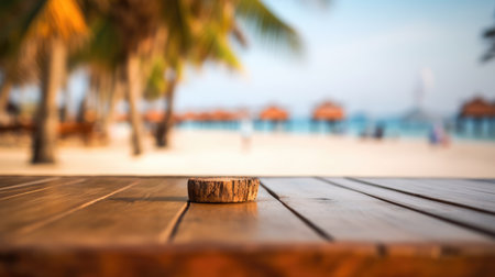 Wooden tabletop with a soft-focus view of a beach bar at a tropical resort, perfect for showcasing products in a relaxed, sunny setting