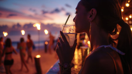 Under the midnight sky, a woman is enjoying a refreshing drink of water through a straw on the beach. The sound of music adds to the fun atmosphere during this latenight beach event AIG50