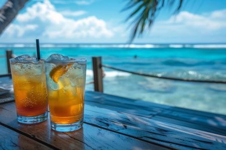 Two drinks are sitting on a table at the beach, AI