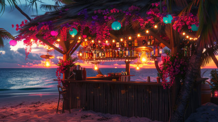 Beach kiosk decorated with hanging lights and tropical flowers, with a colorful drinks bar. generative ai