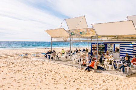 Benidorm, Spain - January 14, 2018: People resting, reading and playing chess resting in public Benidorm Levante Beach Library area