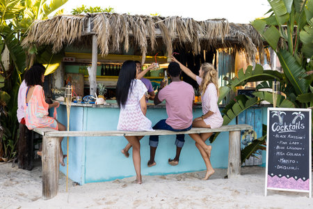 Happy diverse friends having party at beach, making a toast. Spending quality time, lifestyle, friendship, summertime and vacation concept.