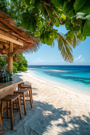Wooden beach bar with stools offering refreshing drinks on a tropical island with white sand and turquoise water