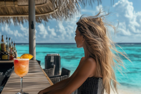 A woman relaxes at a beach bar, sipping a colorful cocktail with turquoise waters in the background.