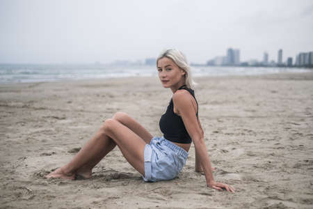 Portrait of pretty caucasian young woman with blond hair, wearing denim shorts and short top. Sitting on the beach. Looks directly at camera.