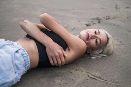 Portrait of beautiful fit caucasian young woman with blond hair, wearing denim shorts, short top. Laying on the sand on the beach. Expressive face