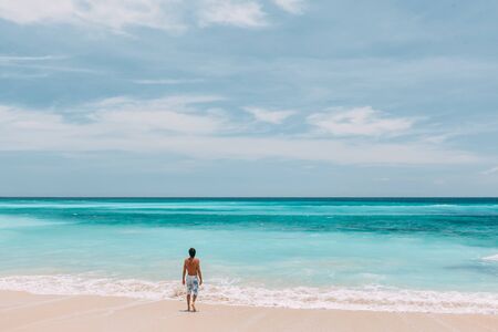 Man in swimming shorts enjoys his tropical beach vacation while walking along sandy lagoon with a paradise view